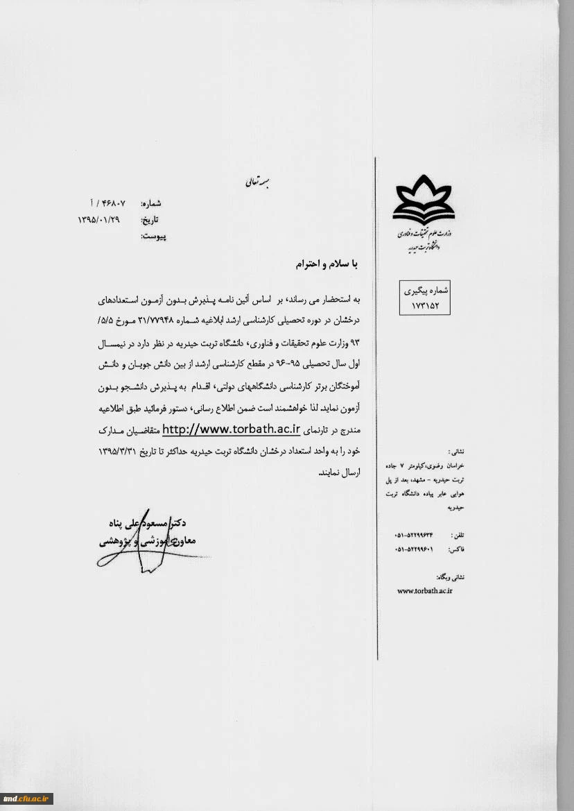 پذیرش دانشجو در مقطع کارشناسی ارشد دانشگاه تربت حیدریه