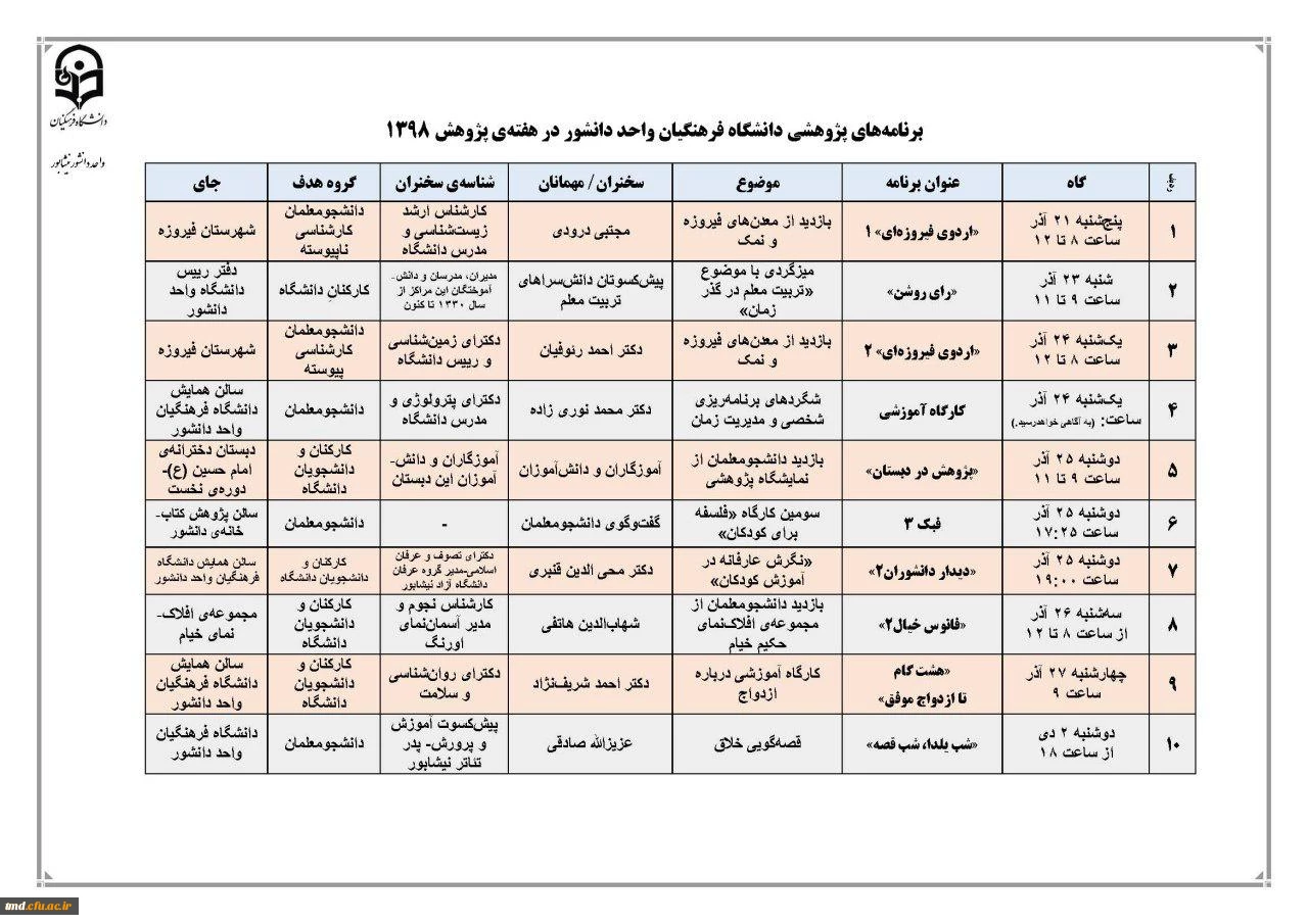 روز شمار هفته پژوهش و برنامه های واحد دانشور در این هفته