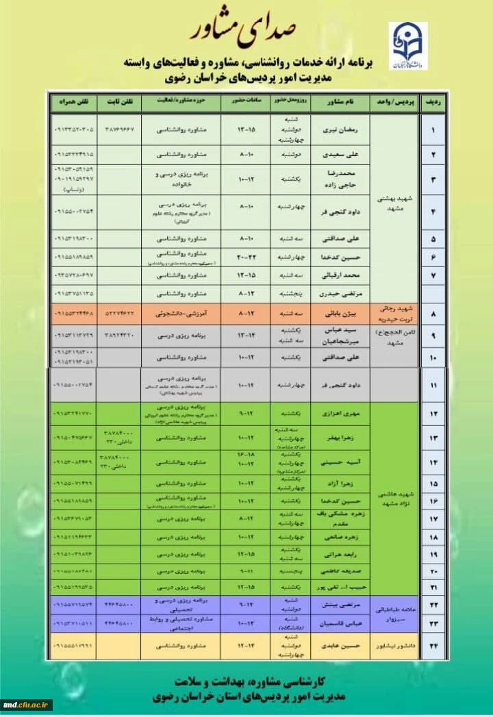 امتیاز دهید : برنامه ارائه خدمات مشاوره ای دانشگاه فرهنگیان استان خراسان رضوی 2 یکشنبه 2 آذر 1399 ساعت 9:02