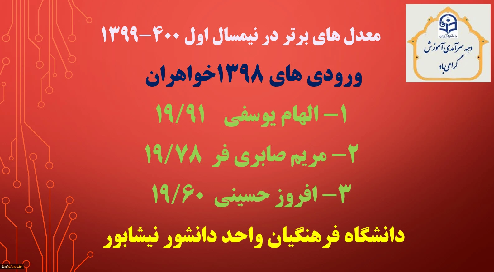 امتیاز دهید : به مناسبت هفته سرآمدی آموزش منتشر شد : برترین های معدل در نیمسال اول 400-1399 5 شنبه 11 اردیبهشت 1400 ساعت 10:15