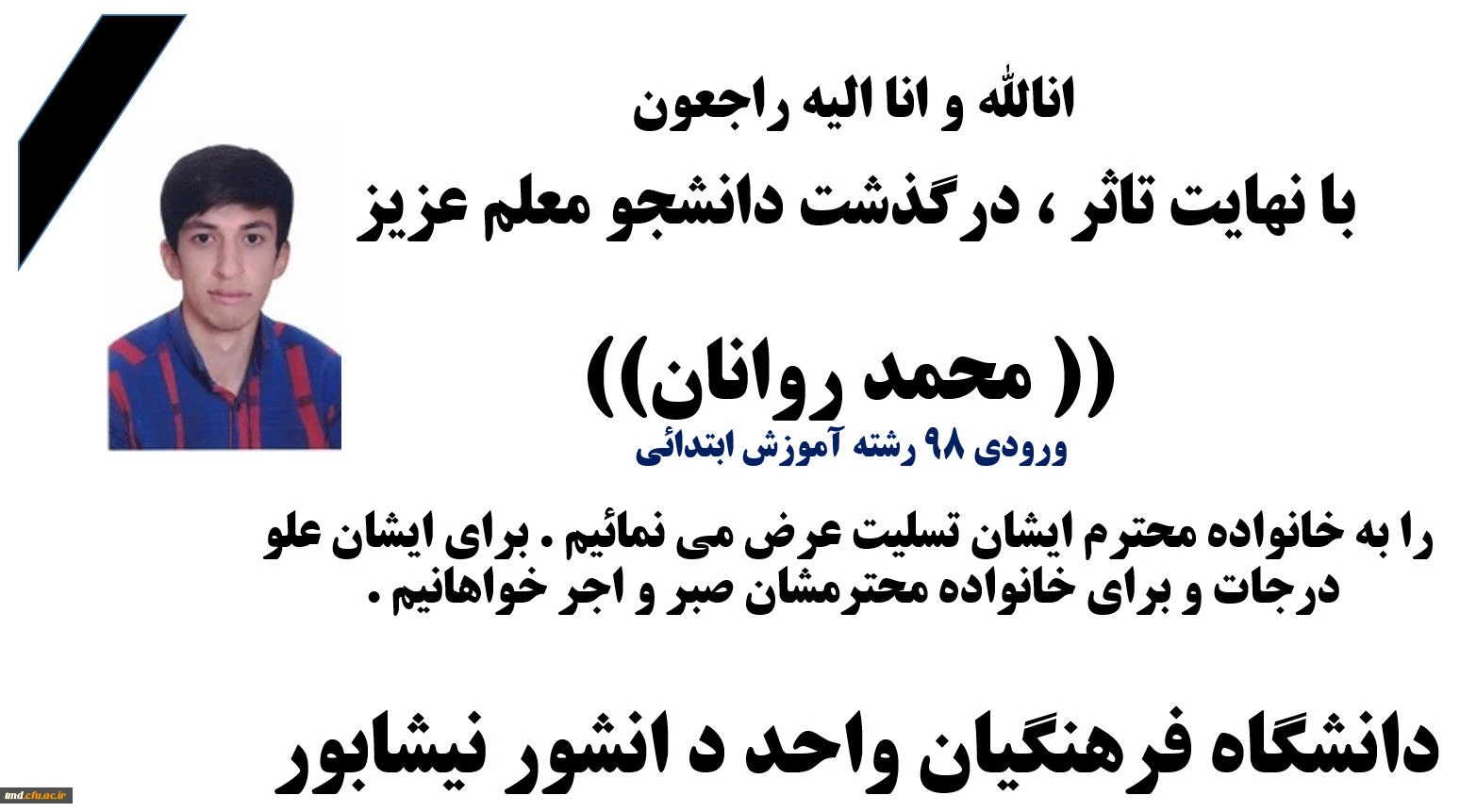 امتیاز دهید : با نهایت تاثر درگذشت دانشجو معلم محمد روانان را به خانواده محترمشان تسلیت عرض می نماییم . سهشنبه 25 آبان 1400 ساعت 13:05
