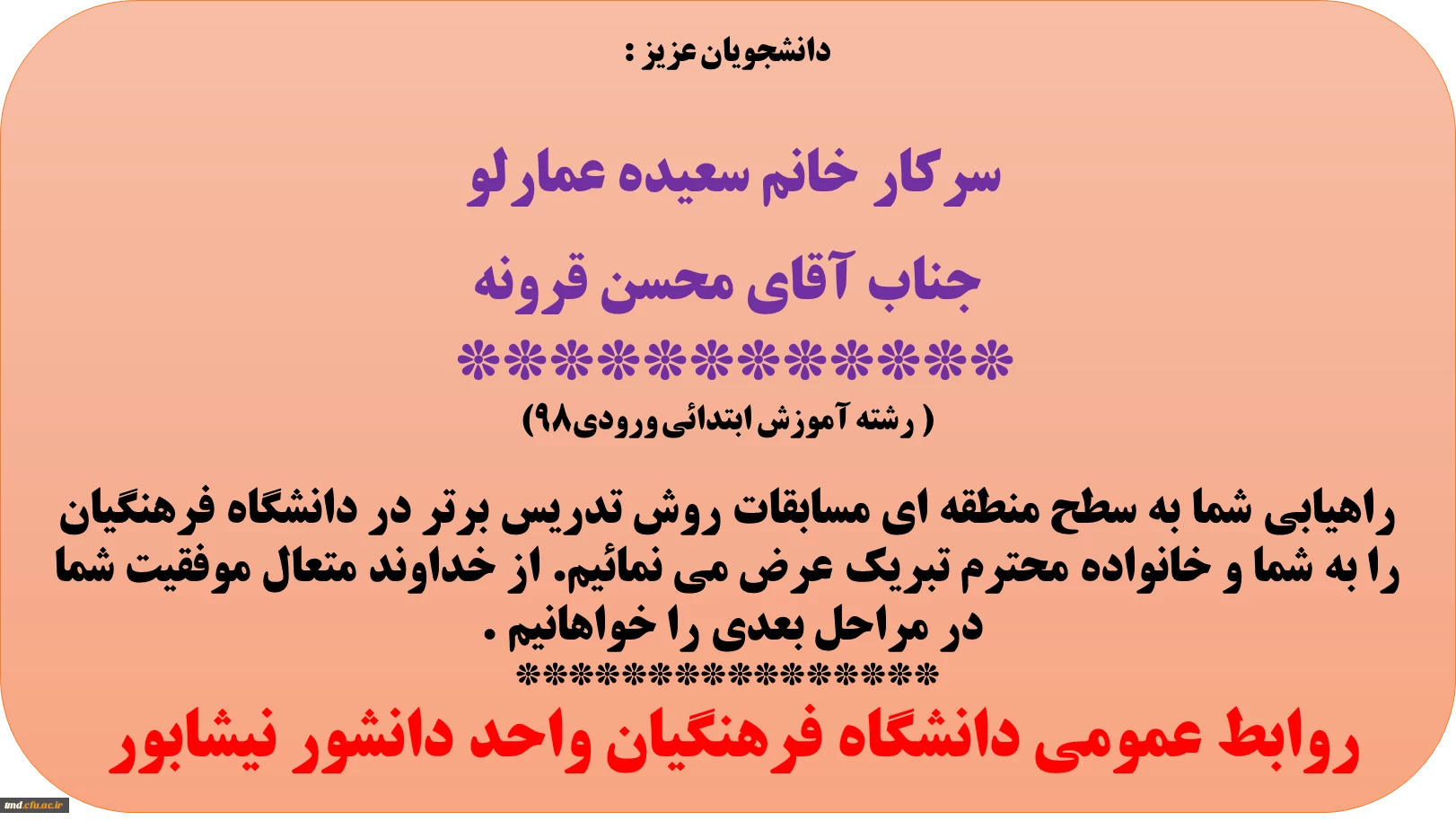 امتیاز دهید : تبریک به دانشجویان عزیز سرکار خانم عمارلو و آقای قرونه جمعه 15 اردیبهشت 1402 ساعت 12:56