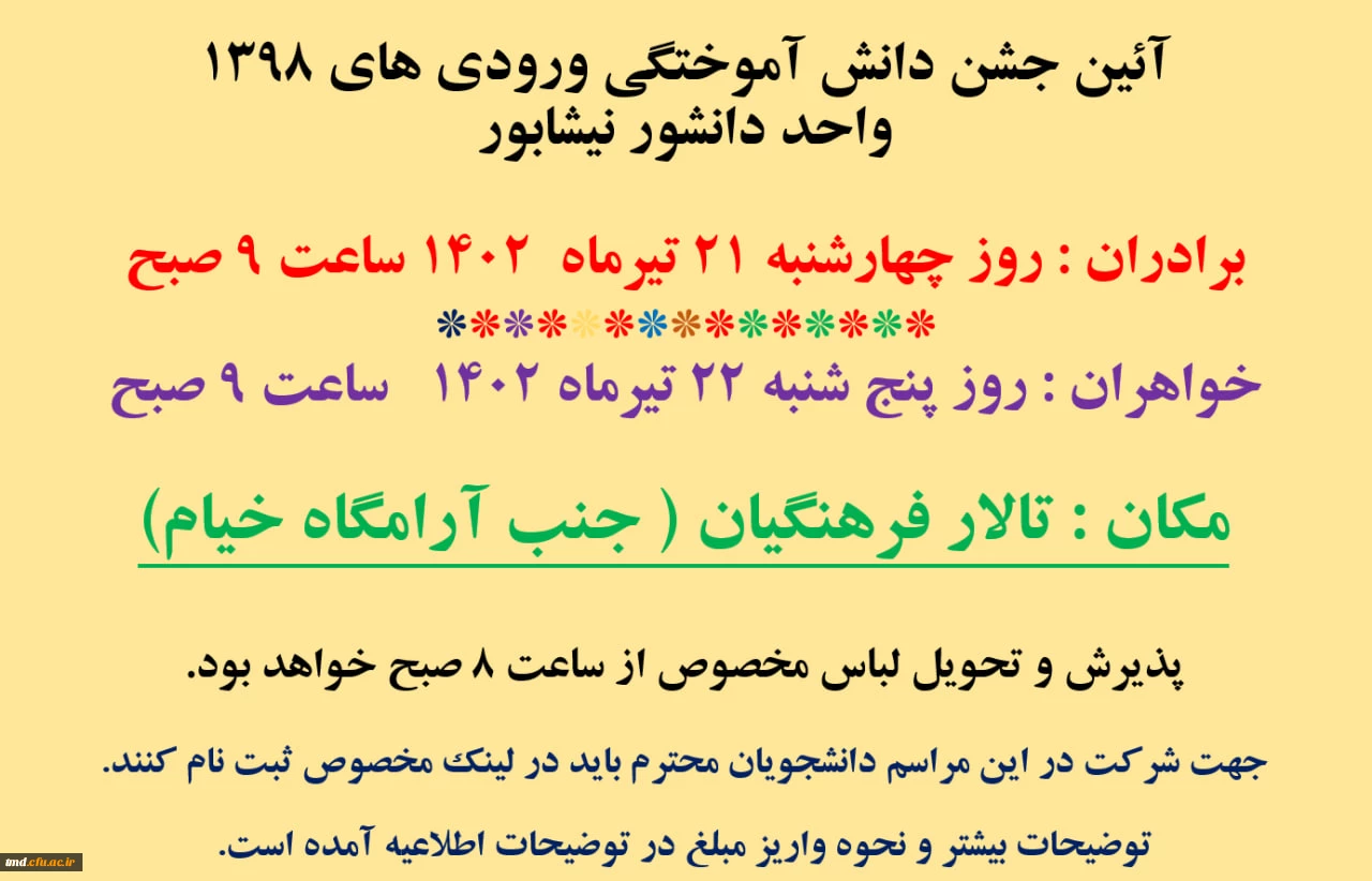 امتیاز دهید : قابل توجه دانشجویان ورودی 98 ( برادران و خواهران ) ثبت نام در جشن آئین دانش آموختگی 2 شنبه 10 تیر 1402 ساعت 8:24